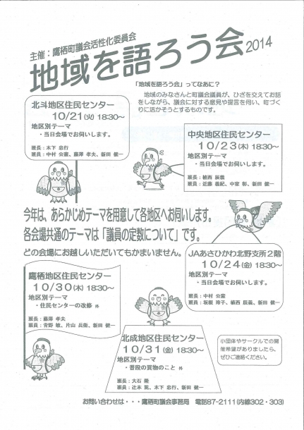 今年も各地区に参加して頂いた皆様より町全般の建設的な意見と地区の課題等について意見交換をする事が出来ました。 また、今年の共通テーマである議員定数の課題では、減らす事より最低限の仕事をする体制は何人なのかを考えるべきとの意見も頂きました。 今後も広聴・広報の取り組みとして、様々な機会を通じて町民との意見交換や議論をする体制が最も重要であると再認識を致しました。