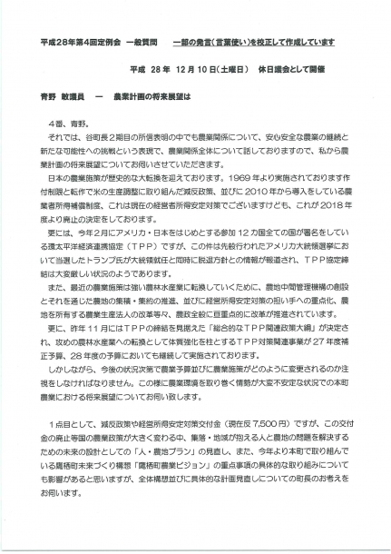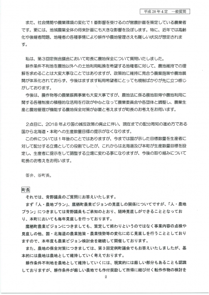 今回の一般質問は、「鷹栖町農業の将来展望」と題して町長に質問しました。