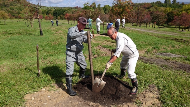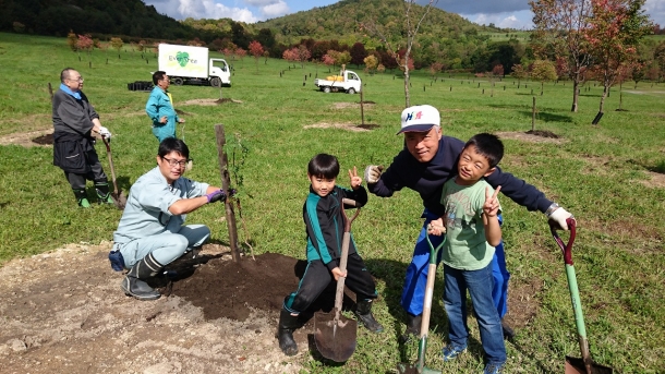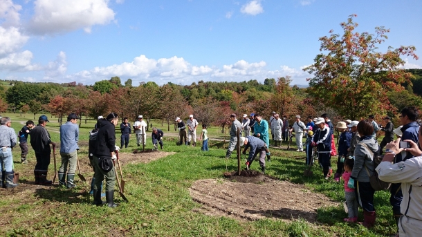 今年も絶好の晴天の元で、今年の植樹祭に総勢80名を超える多くの町民が参加して、旭川トヨペット、本田技研、建築士会旭川各社より寄贈された苗木の植樹作業と様々な思いを込めた記念植樹(桜の苗木)が実施された。
