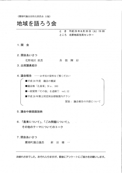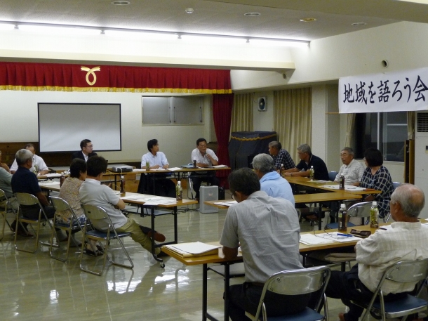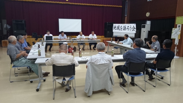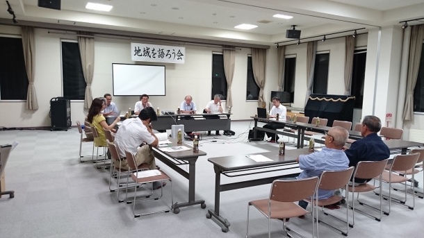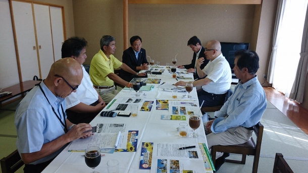 意見交換会及び溝畑氏を囲んでの記念写真(佐野町長・佐々木議長・竹内副町長・佐光議員・有馬課長)