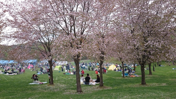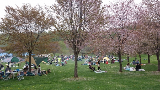 満開の桜と独特なさくらの香りが漂う当地で、多くの家族連れが七輪を囲んで焼き肉の匂いと煙に包まれて和やかな団欒を楽しんでいました。
